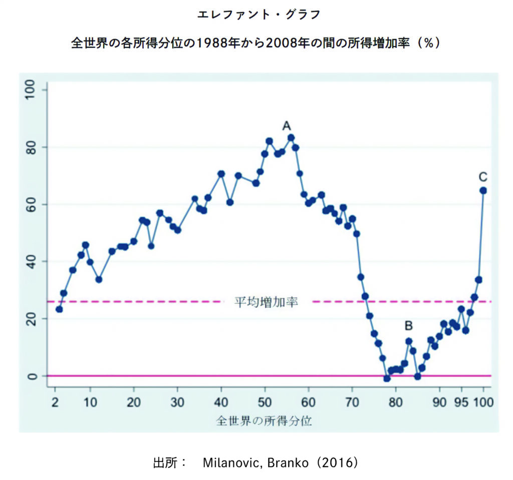 当時、世界銀行エコノミストのブランコ・ミラノビッチ氏が提起、賃金の伸びない先進国中間層の貧困と格差を説明するグラフだとされていました。